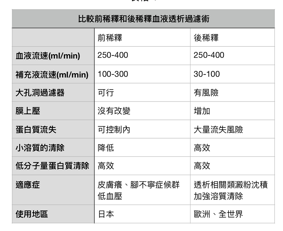 前稀釋和後稀釋血液透析過濾術2018年10月8日讀畢需時 1 分鐘1970年末,發展血液過濾術,利用對流來增加中分子的清除,但是小溶質清除卻變差;因此發展血液透析過濾術(HDF)來有效清除中分子和小溶質。後稀釋血液透析過濾術,過濾後,血液會濃縮,因而會被血液流速所限制,否則會有蛋白質流失和血液凝固的問題;相對地,前稀釋就沒有這些問題,可以不被血流量限制住補充液量。前稀釋和後稀釋血液透析過濾術的比較如下表: