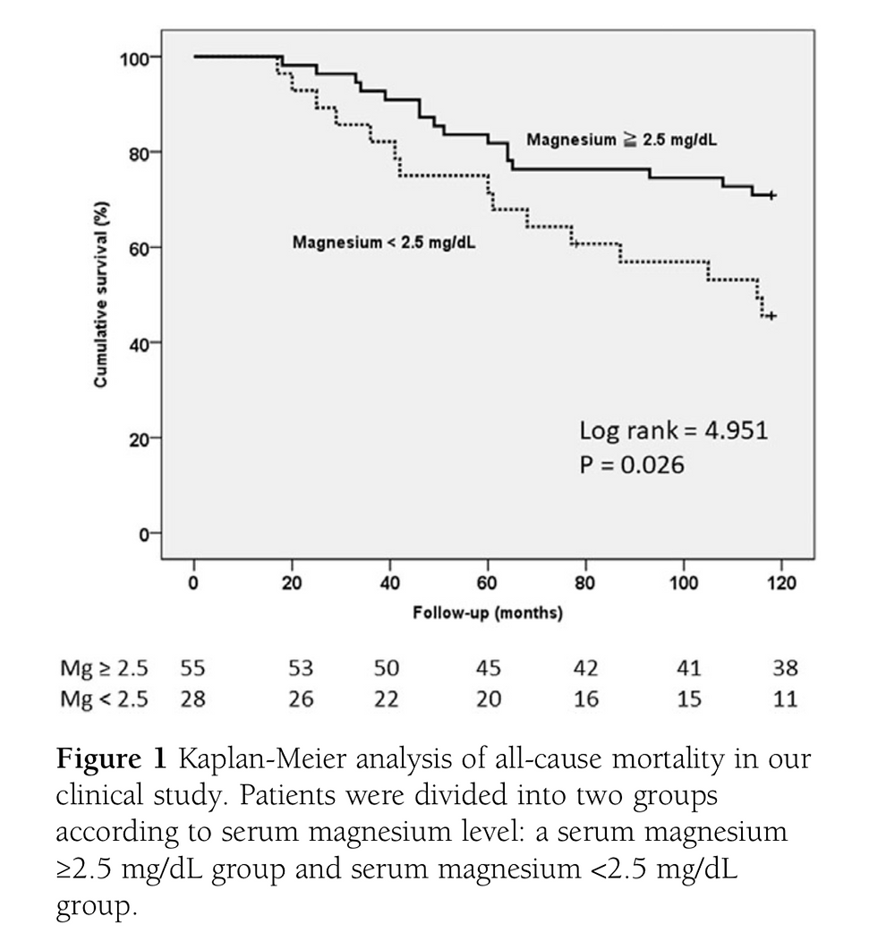 由於失去腎臟排泄功能,血清鎂會因為食物、含鎂的藥物攝取和固定透析液濃度,血液透析腎友血清鎂會高於一般人群,因此會更著眼於避免高血鎂可能引發生理的副作用;然而近來研究報告,較高的血清鎂值,和透析腎友低死亡率有關。這篇日本回溯10 年,追蹤83位非糖尿病血液透析腎友,血清鎂低於2.5mg/dl的腎友有較高的死亡率,相對地,血清鎂高於2.5mg/dl的腎友會減少62%的死亡風險。通常血清鎂高的腎友營養狀態較好,血清白蛋白、肌酐酸和磷也會較高。而營養不良可能也是低血鎂腎友死亡風險較高的一個理由,低血鎂也會有較高的發炎指數,而發炎反應是另一個較高死亡率的因素。因此探討適合血液透析腎友,血清鎂的正常範圍是下一個重要的領域。